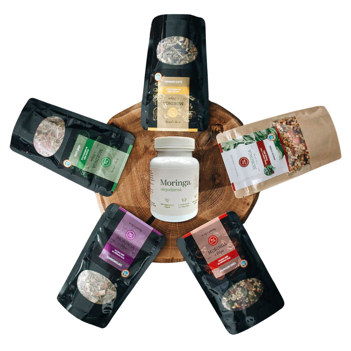 Dárkový balíček obsahuje 5 sypaných 50g čajů a moringu olejodárnou v kapslích (90 ks):